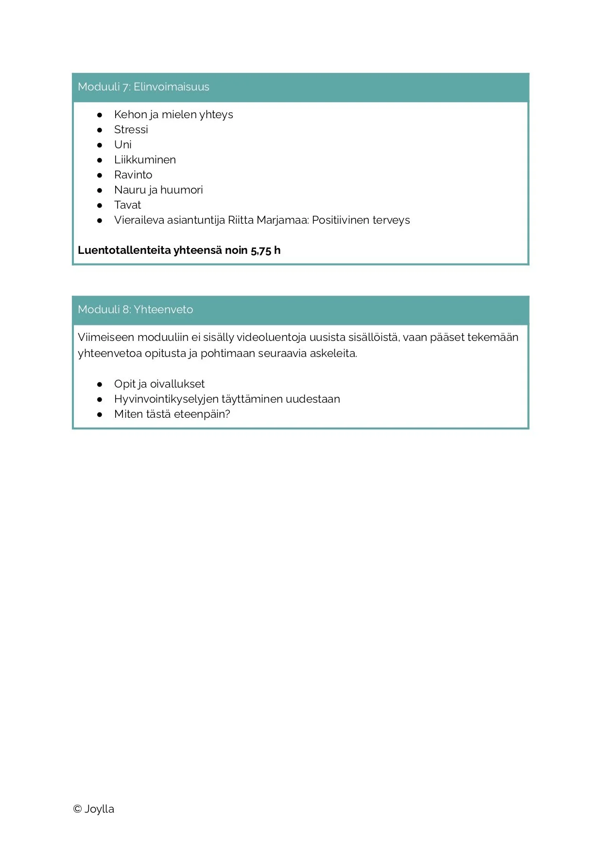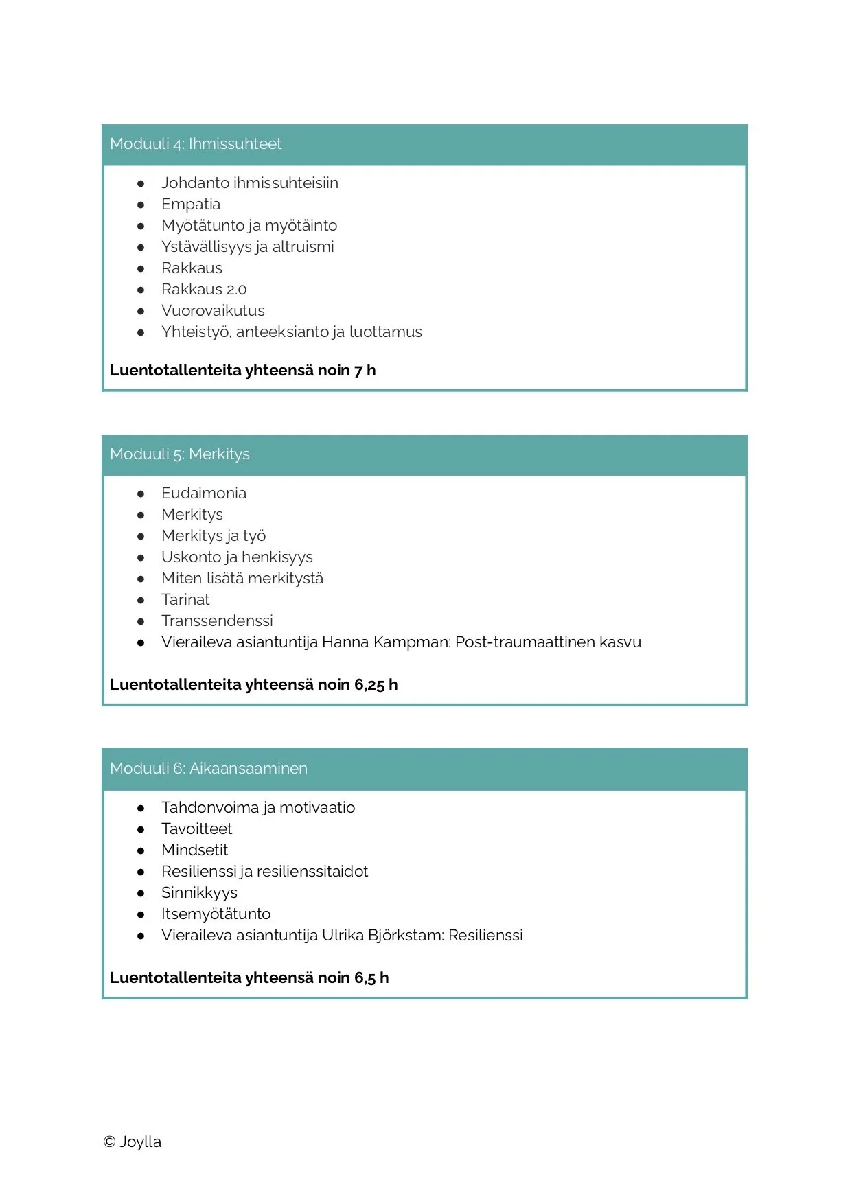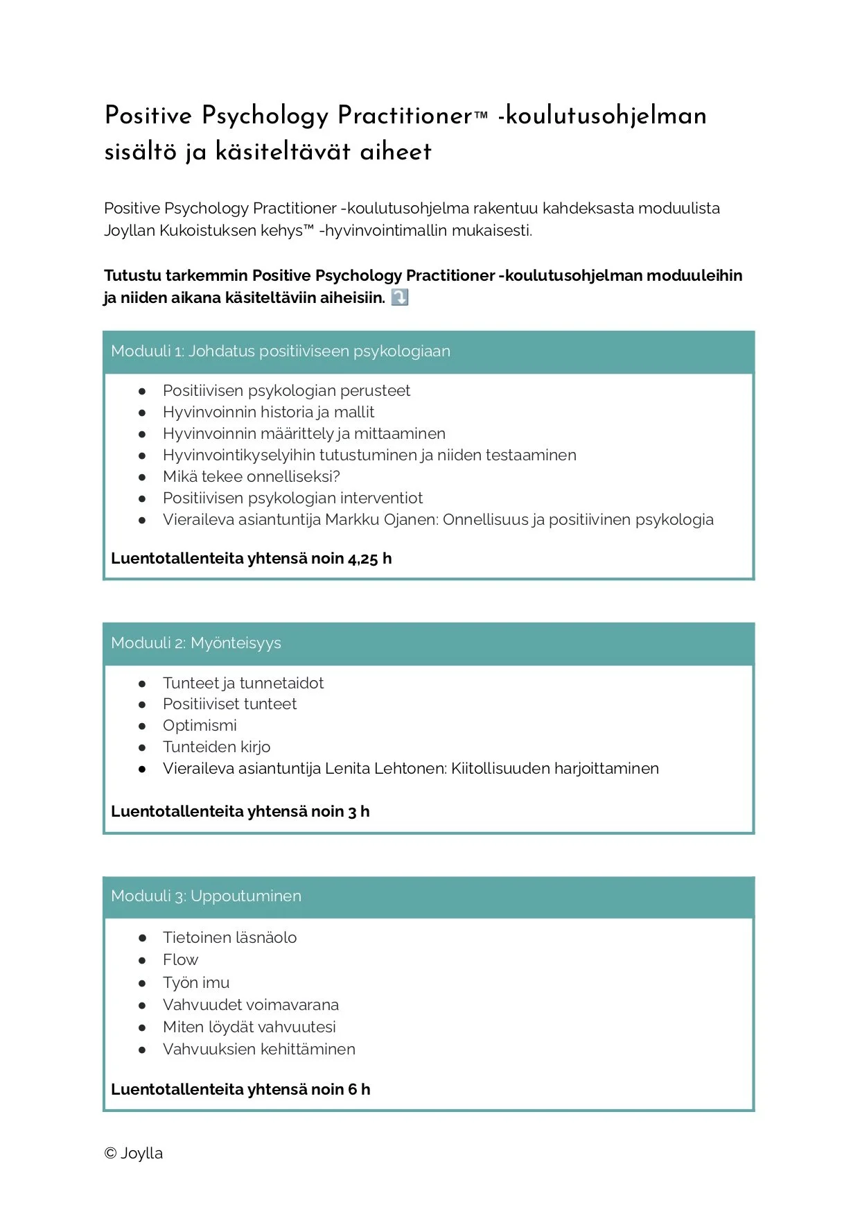 Koulutuksessa saat pääsyn kaikkiin PPP-koulutusohjelman (32 op) materiaaleihin (mm. uudet videoluennot ja tehtäväkirjat). Koulutus etenee Kukoistuksen kehys™ -mallin mukaisesti kuten aiemminkin. Kehyksen aihealueita on kuitenkin materiaalien uusimisen yhteydessä kehitetty, täydennetty ja päivitetty. Lisäksi mukana on uusia teemoja ja asiantuntijaluentoja.